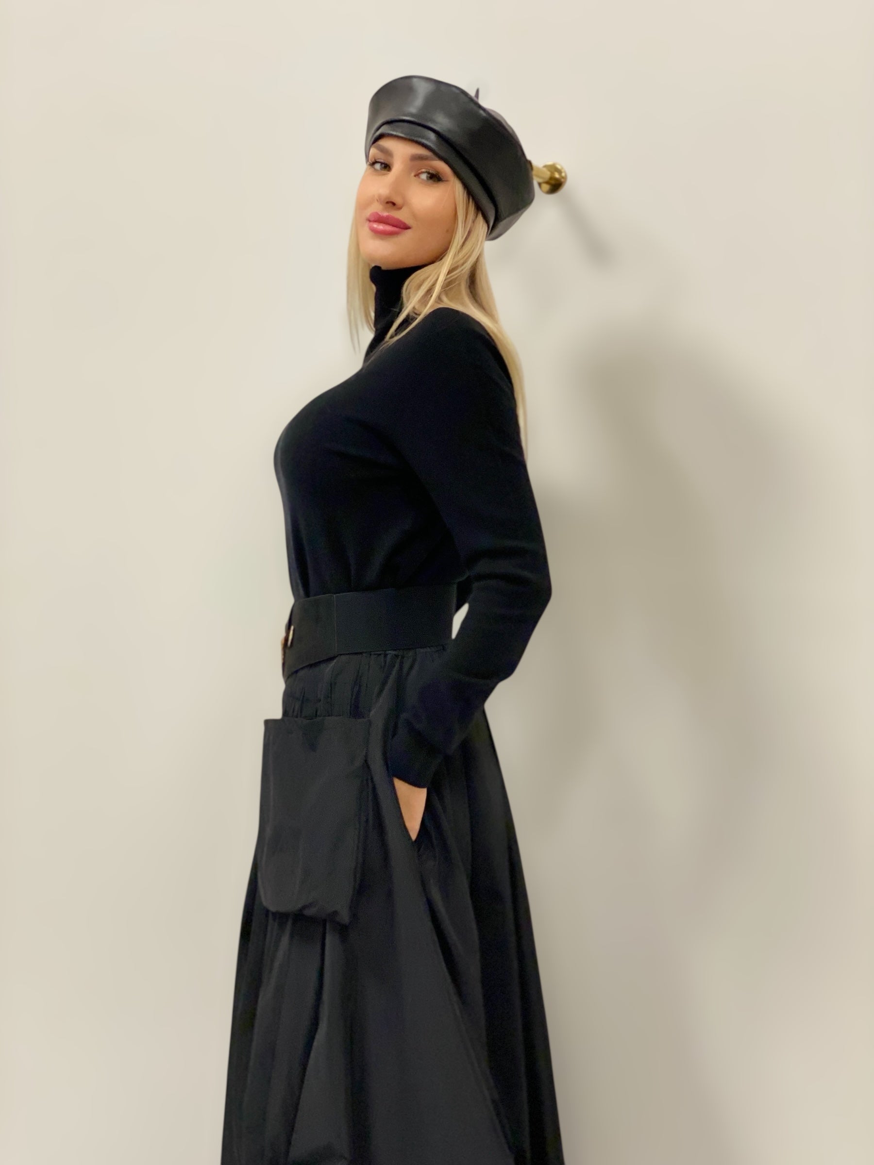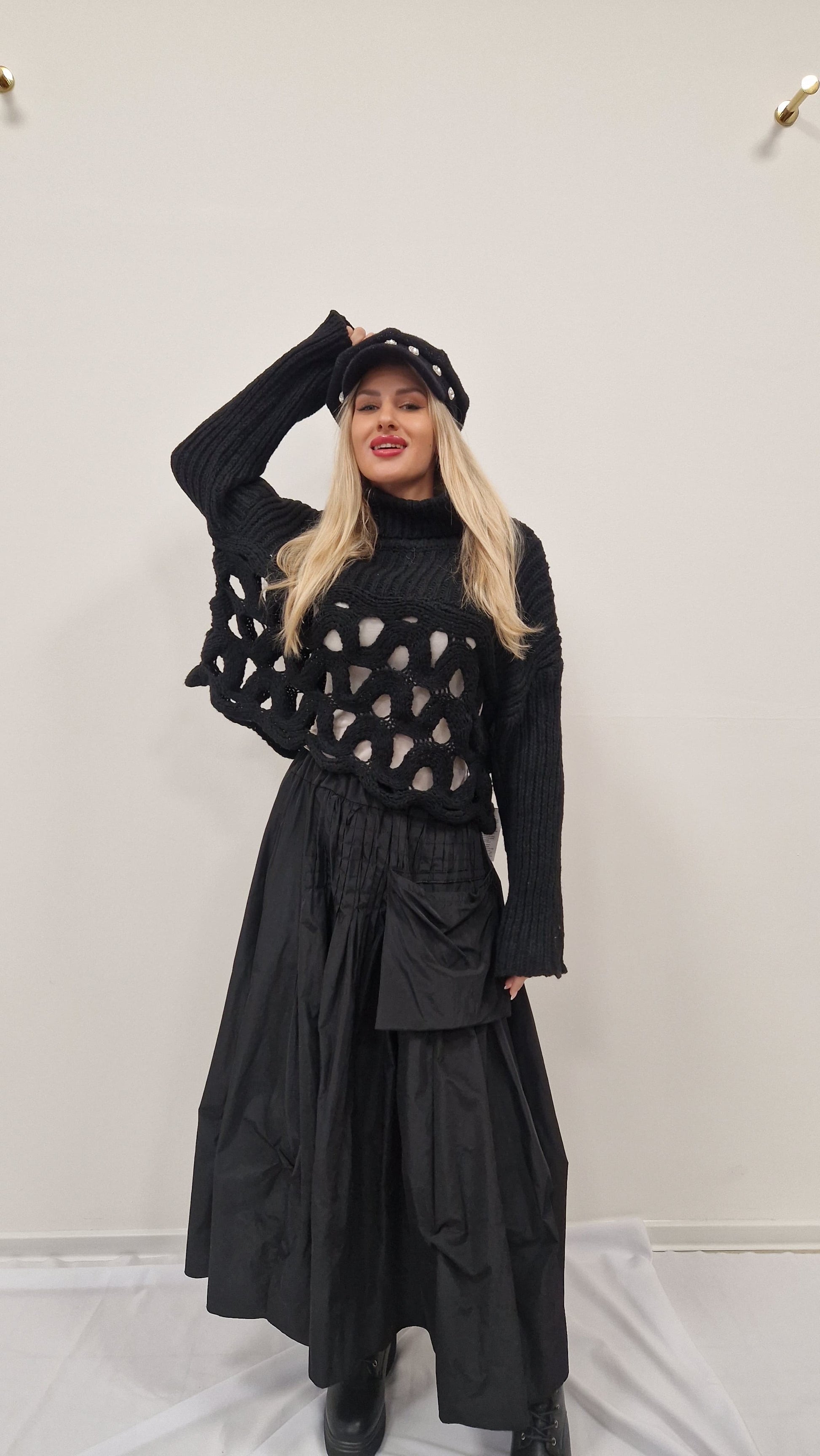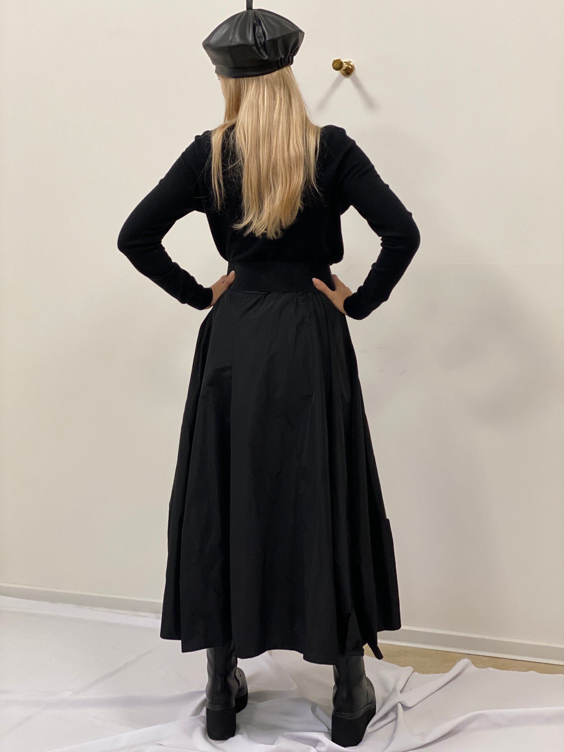 Černá midi sukně ze šusťákoviny – moderní a praktický kousek, který podtrhne váš styl. Elastická guma v pase se pohodlně přizpůsobí postavě, zatímco boční schované kapsy a jedna přední kapsa dodávají sukni funkčnost i ležérní šmrnc. Skvěle vypadá v kombinaci s výrazným páskem, teplým svetrem nebo elegantním topem. Univerzální základ, který snadno proměníte podle příležitosti.